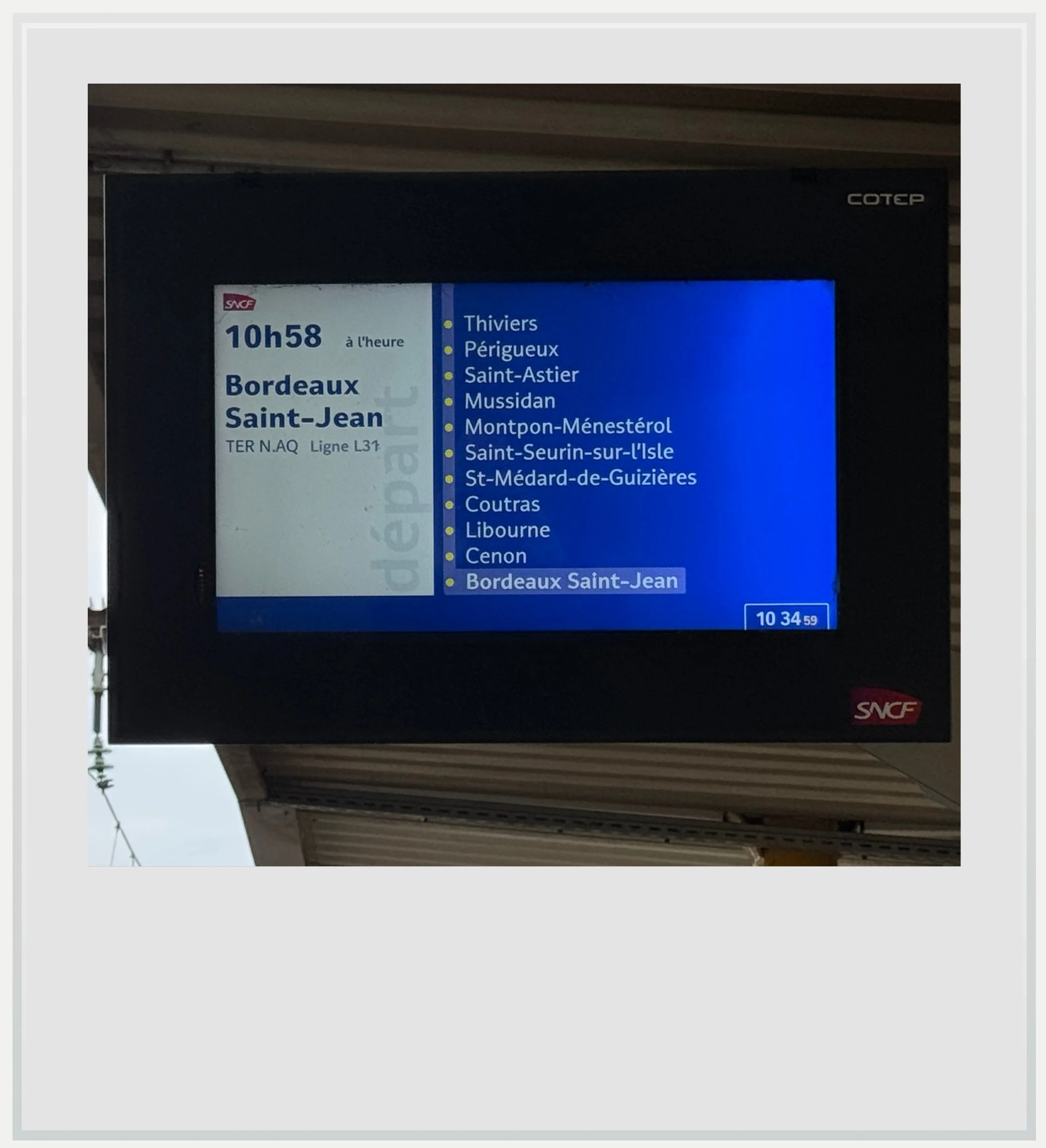 It was sunny again by the time we got to Bordeaux. A few miles before, our train had merged onto the historic main line between Bordeaux and Paris at the Coutras station, and we were now stopping under the monumental glass roof of the Saint-Jean station, right after having cross the Garonne river. A dual TGV Inoui trainset was waiting to leave for Paris a few platforms away, and its white livery was glistening in the afternoon sun.